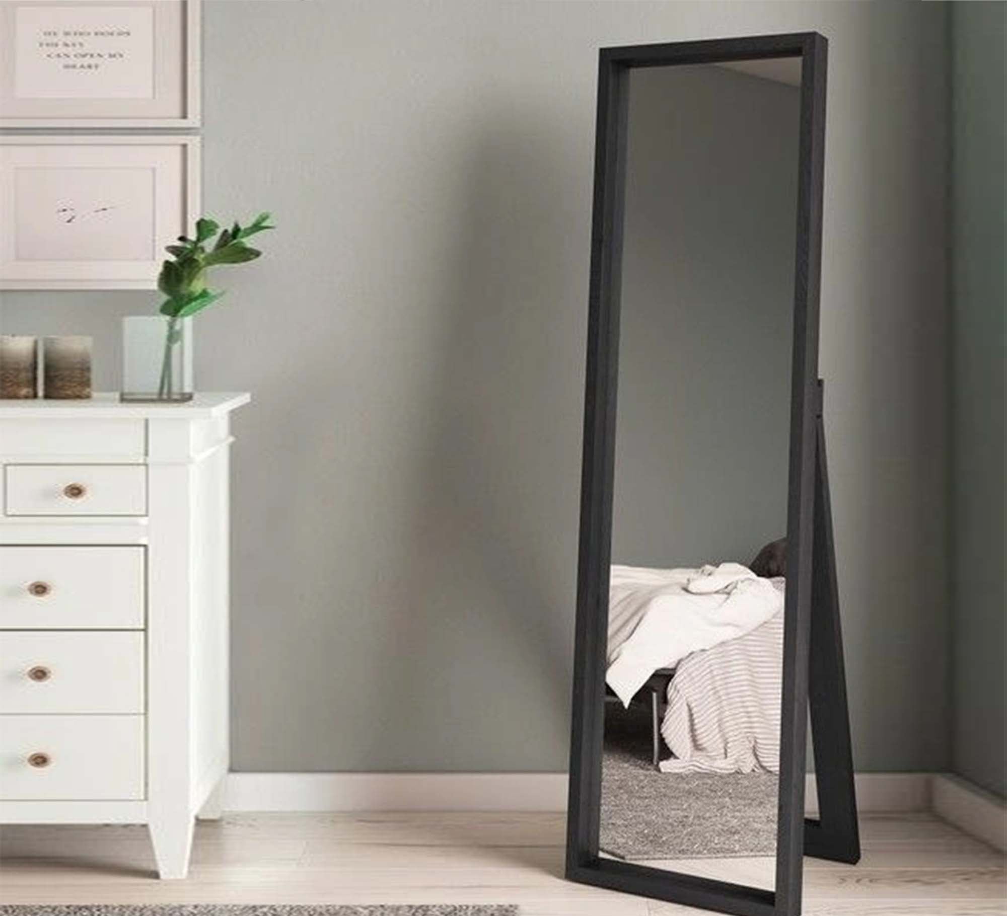 A Modern standing mirror in black epitomizes sophistication with its sleek lines and timeless appeal. Ideal for virtually any room, a black frame mirror is versatile, suiting a range of interior styles from industrial to contemporary.