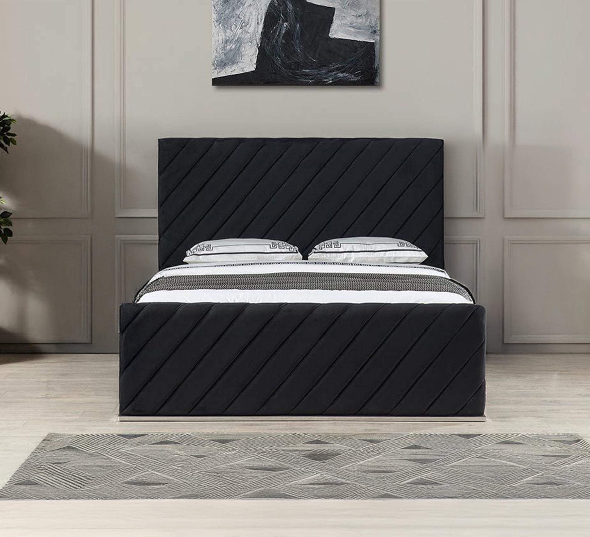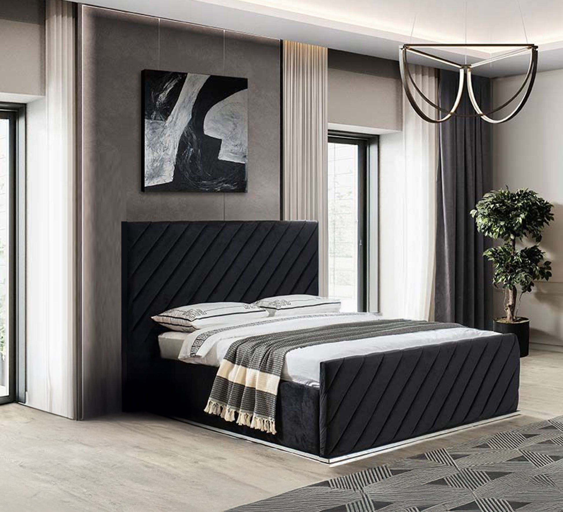 - The backrest is divided by diagonal lines, revealing the beauty of the foam filling, and the sides of the bed are upholstered in velvet fabrics for a distinctive decorative look.