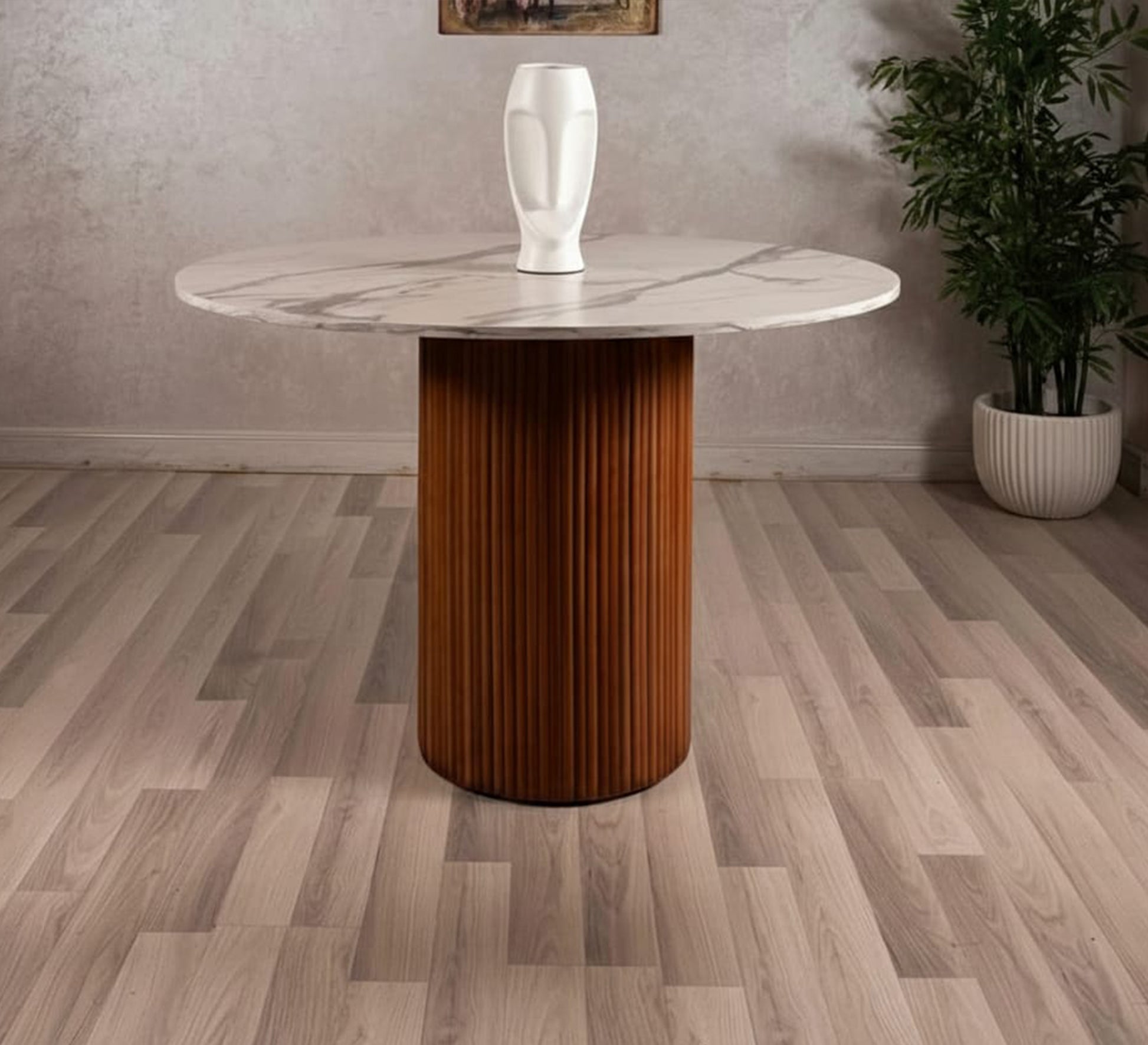 - A dining table with a round base and elegant marble top, combining luxury and modernity in one design. It adds a touch of sophistication to the dining room and provides a comfortable dining space with stability and elegance in every detail.