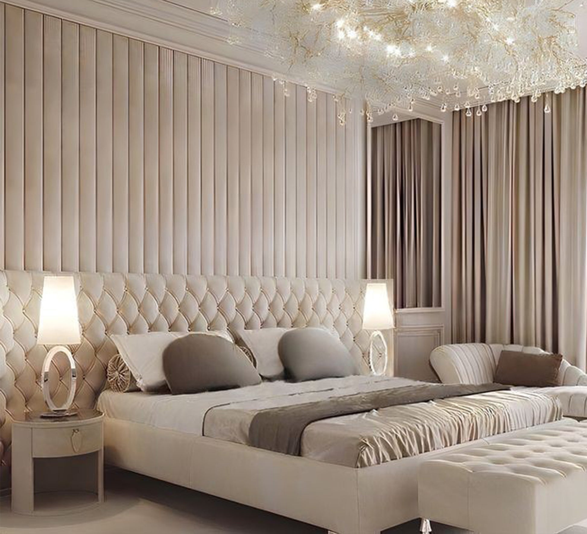 - يتميز هذا السرير الملكي بتصميمه الفندقي الفخم الذي يغلب عليه اللون البيج الهادئ، مما يخلق أجواءً دافئة ومريحة مما يجعله مثالية للاسترخاء والهدوء.