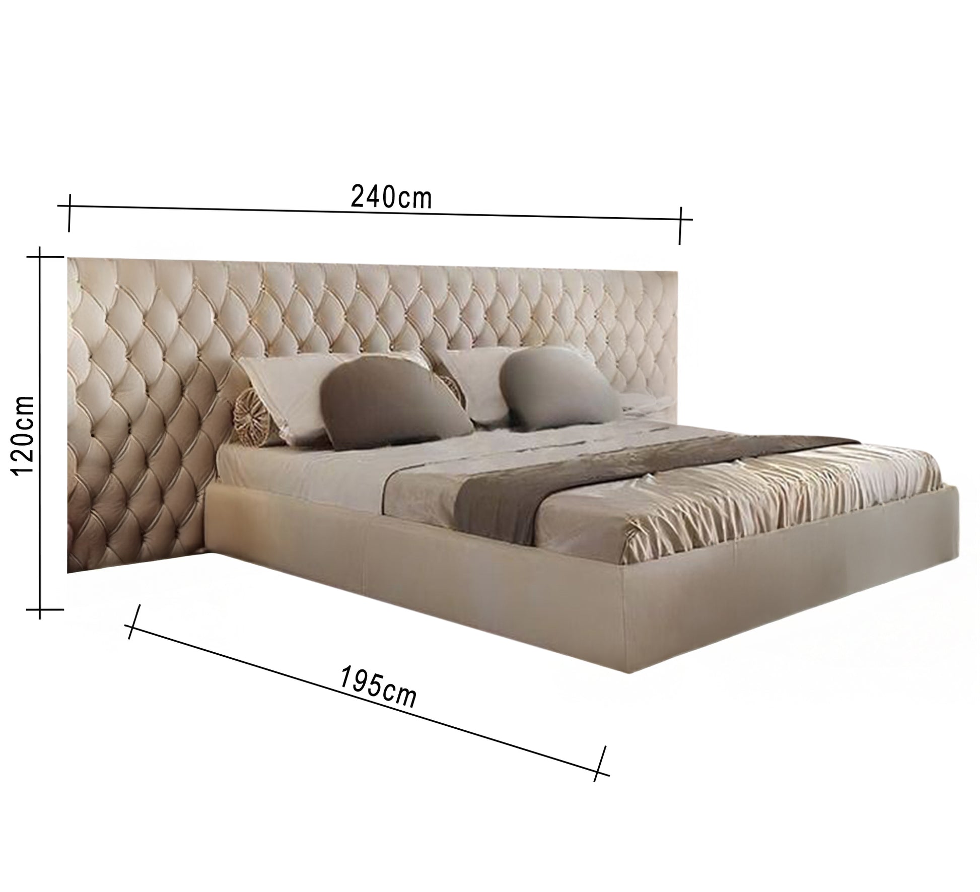 - السرير بطول 195 سم وارتفاع مسند الظهر 120 سم وبعروض مختلفة 240 و260 سم.