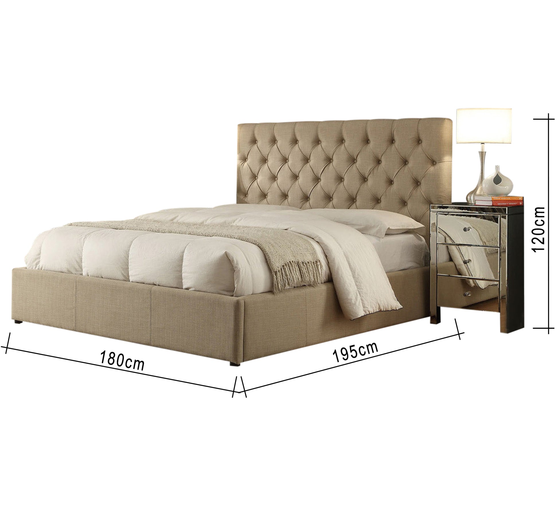 - السرير بطول 195 سم وارتفاع مسند الظهر 120 سم وبعروض مختلفة 100 و120 و140 و160 و180 سم.
