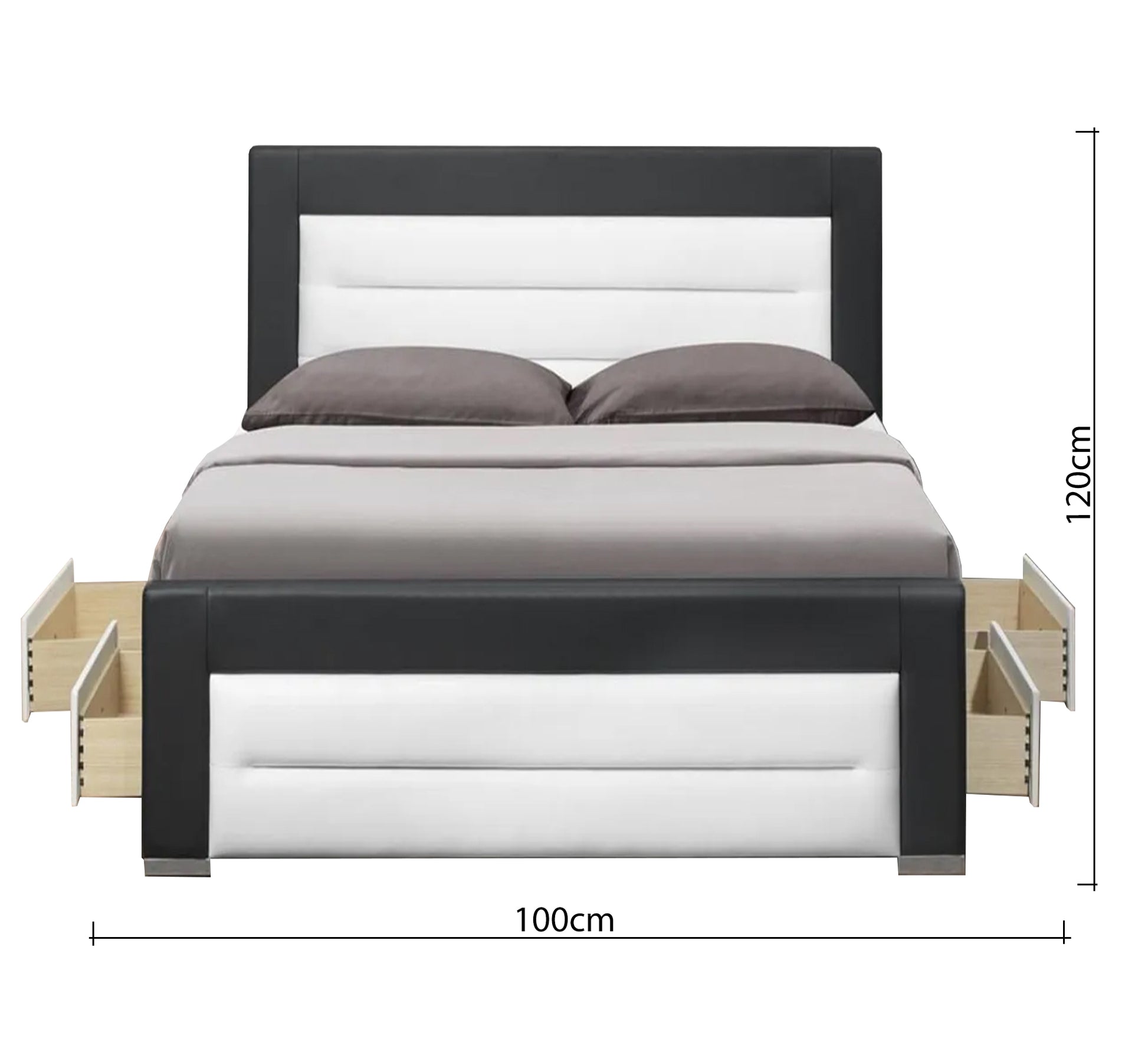 - السرير بطول 195 سم وارتفاع مسند الظهر 120 سم وبعروض مختلفة 100 و120 و140 و160 و180 سم.