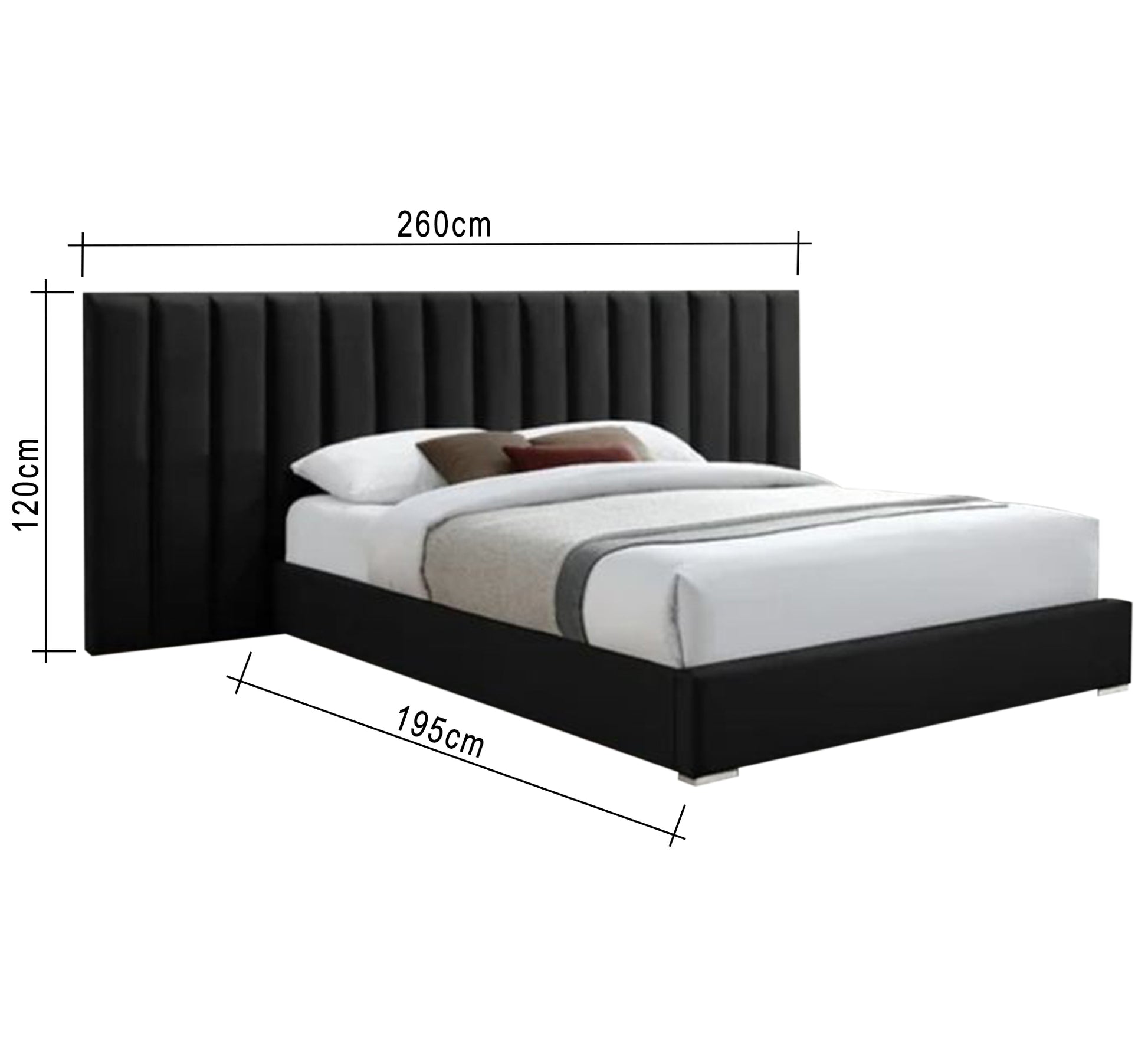 - السرير بطول 195 سم وارتفاع مسند الظهر 120 سم وبعروض مختلفة 240 و260 سم.