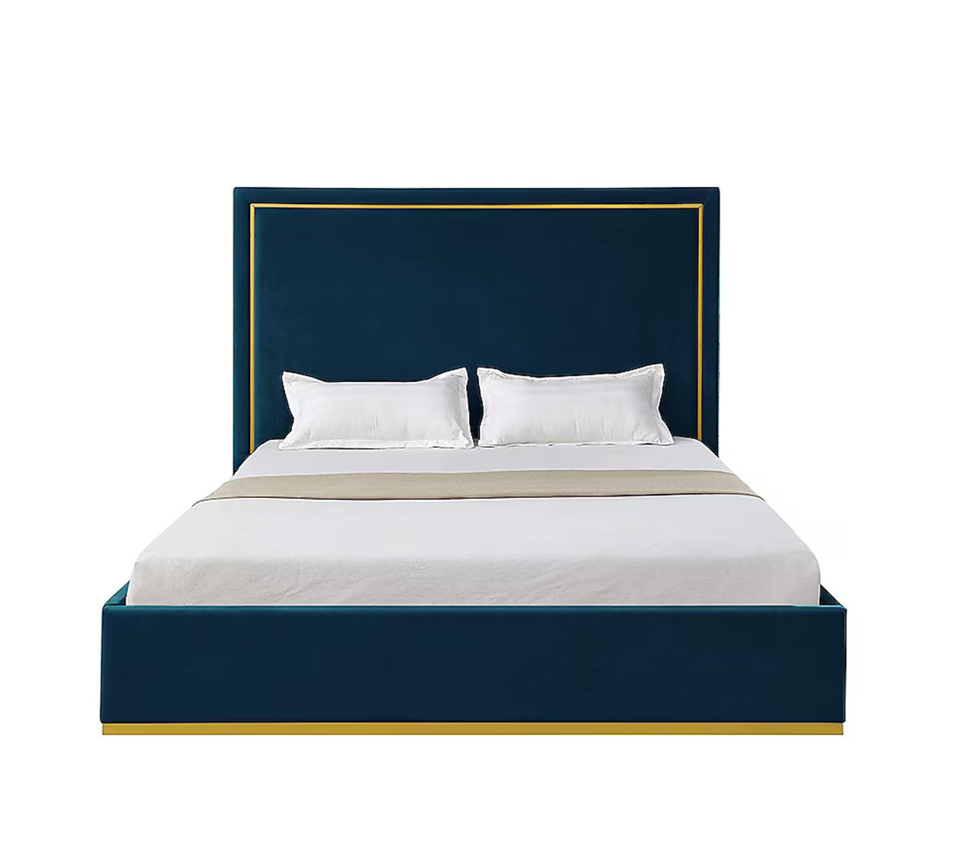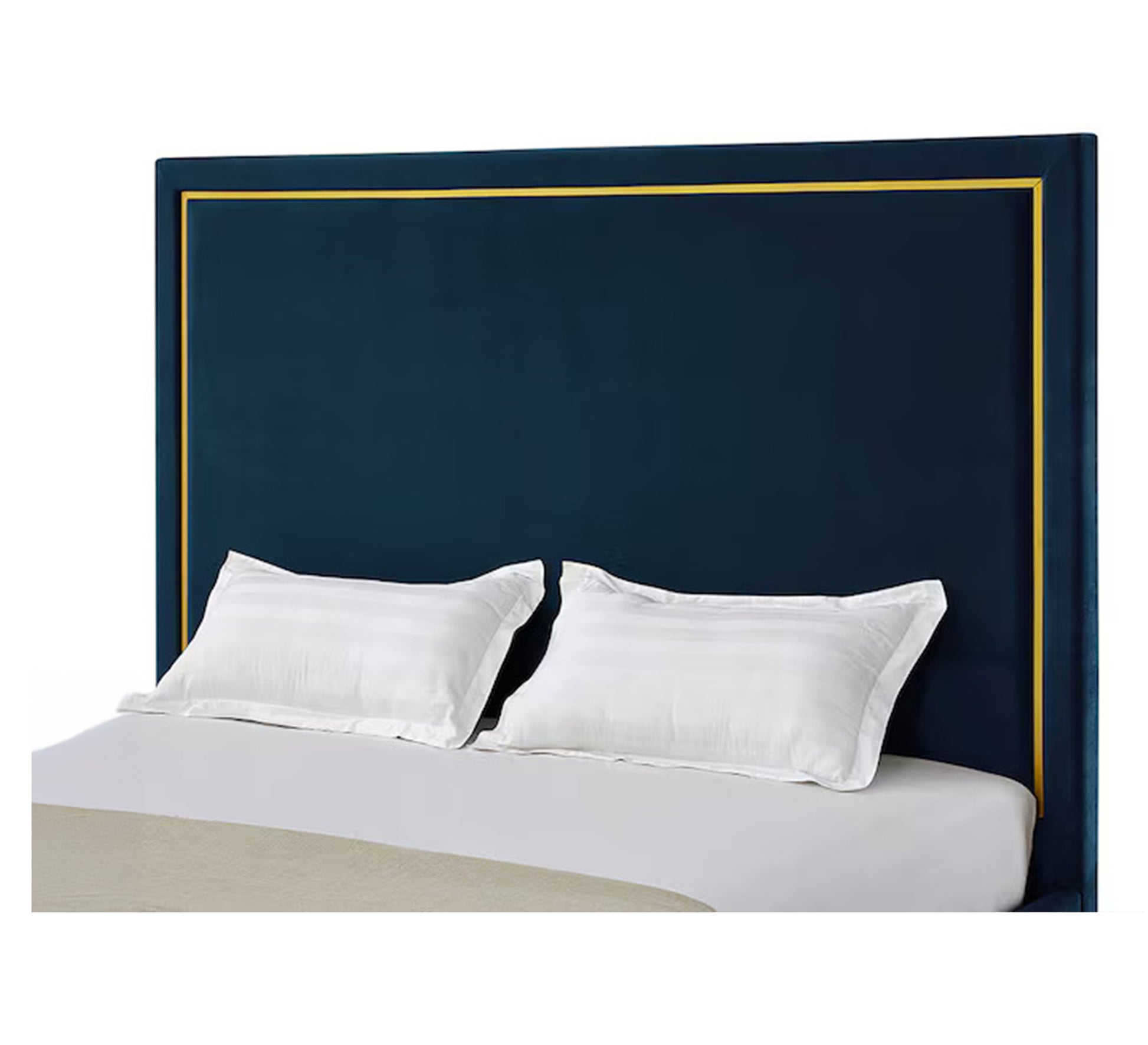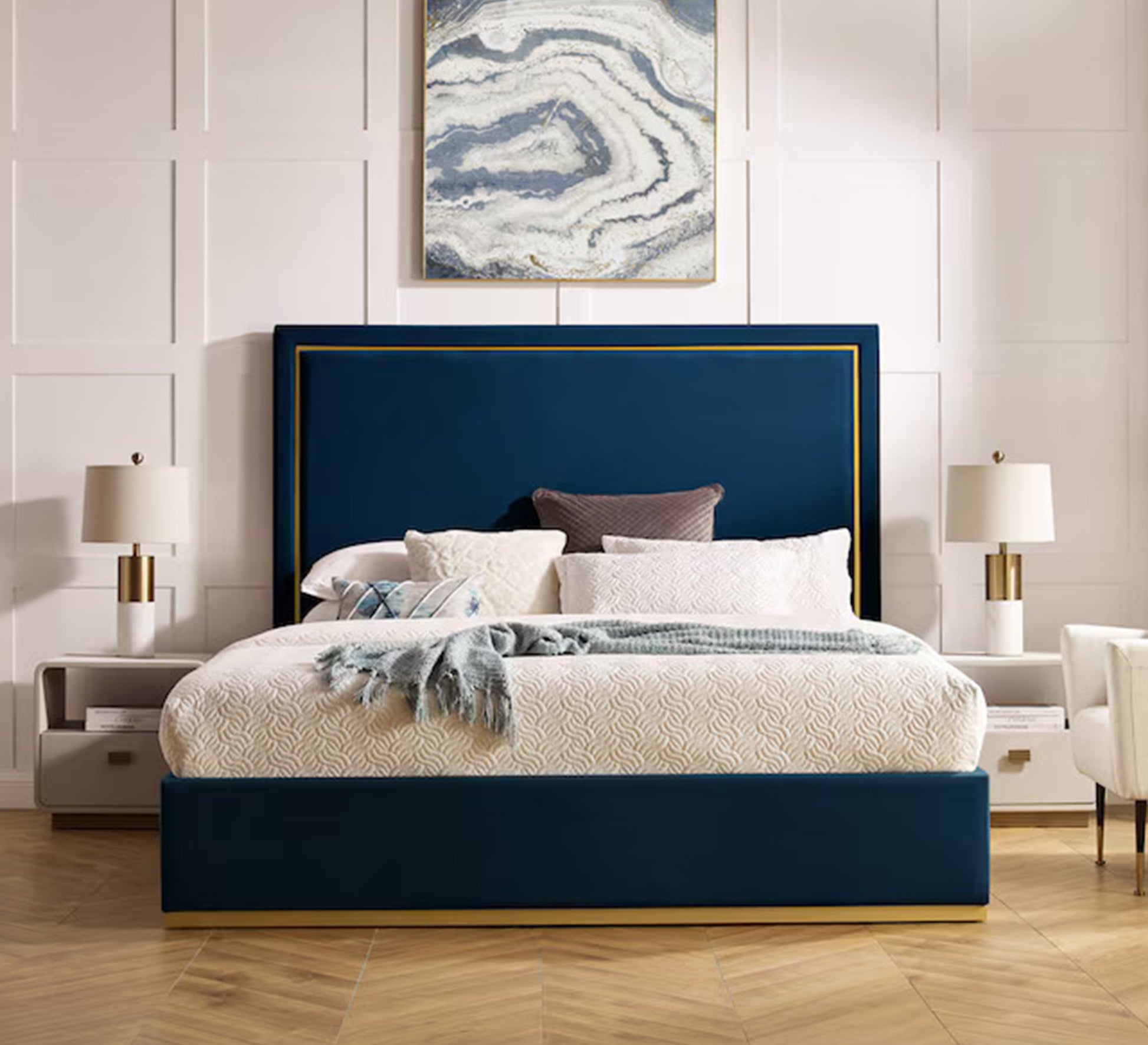 سرير أزرق داكن بإطار ذهبي وفخامة عصرية