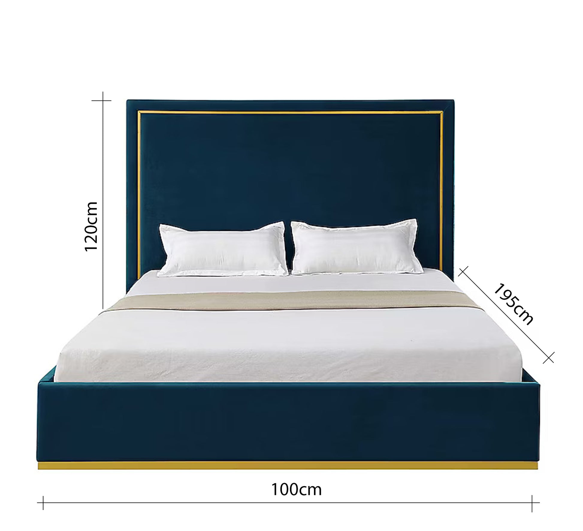 - السرير بطول 195 سم وارتفاع مسند الظهر 120 سم وبعروض مختلفة 100 و120 و140 و160 و180 سم.