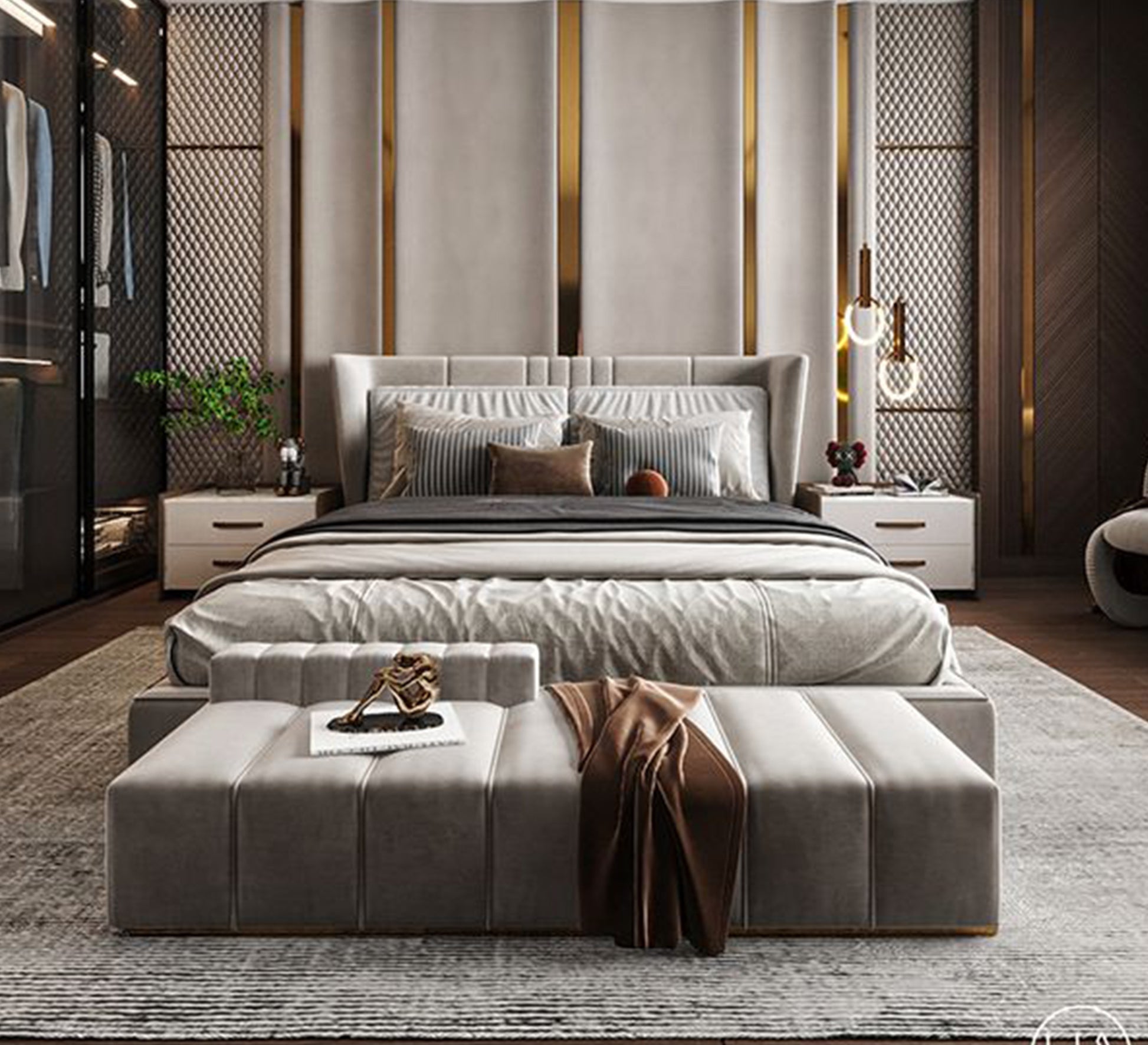 - يتميز هذا السرير بتصميم فندقي فخم يجمع بين الأناقة العصرية والراحة المطلقة، حيث تتناغم الألوان الهادئة مع التفاصيل الذهبية والخشبية لخلق أجواء راقية وجذابة.