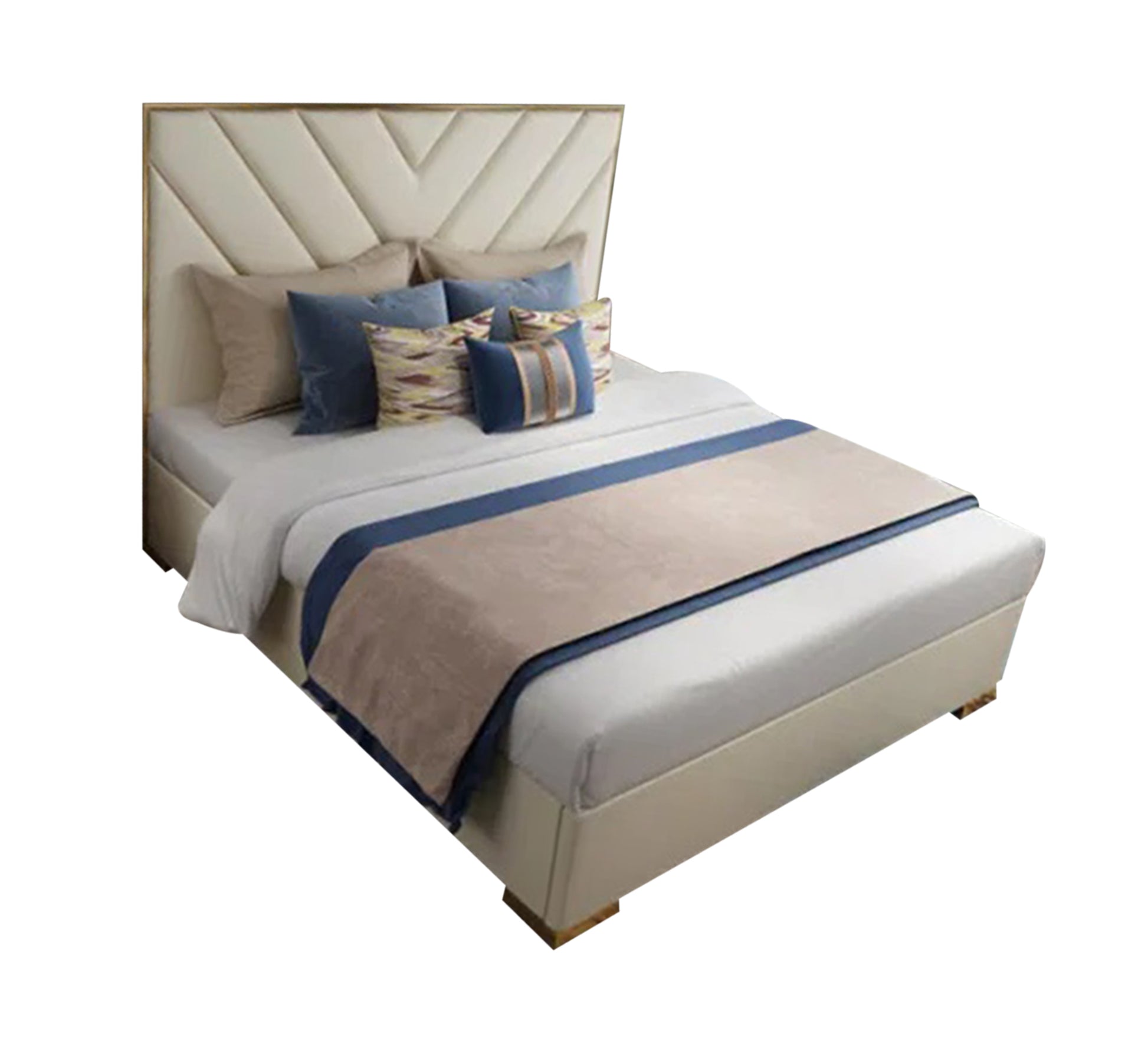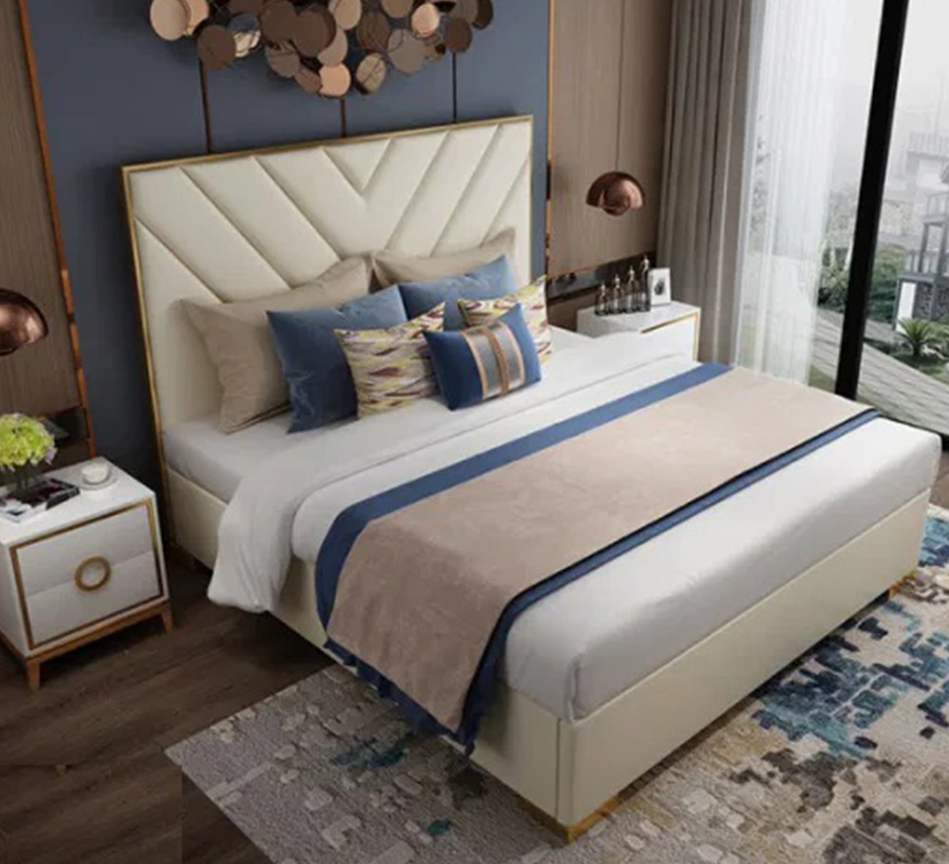 - يتميز هذا السرير العصري بتصميم فاخر ولوح رأسي مبطن بزوايا هندسية أنيقة وتفاصيل ذهبية، مما يضفي عليه مظهرًا راقيًا ومميزًا.
