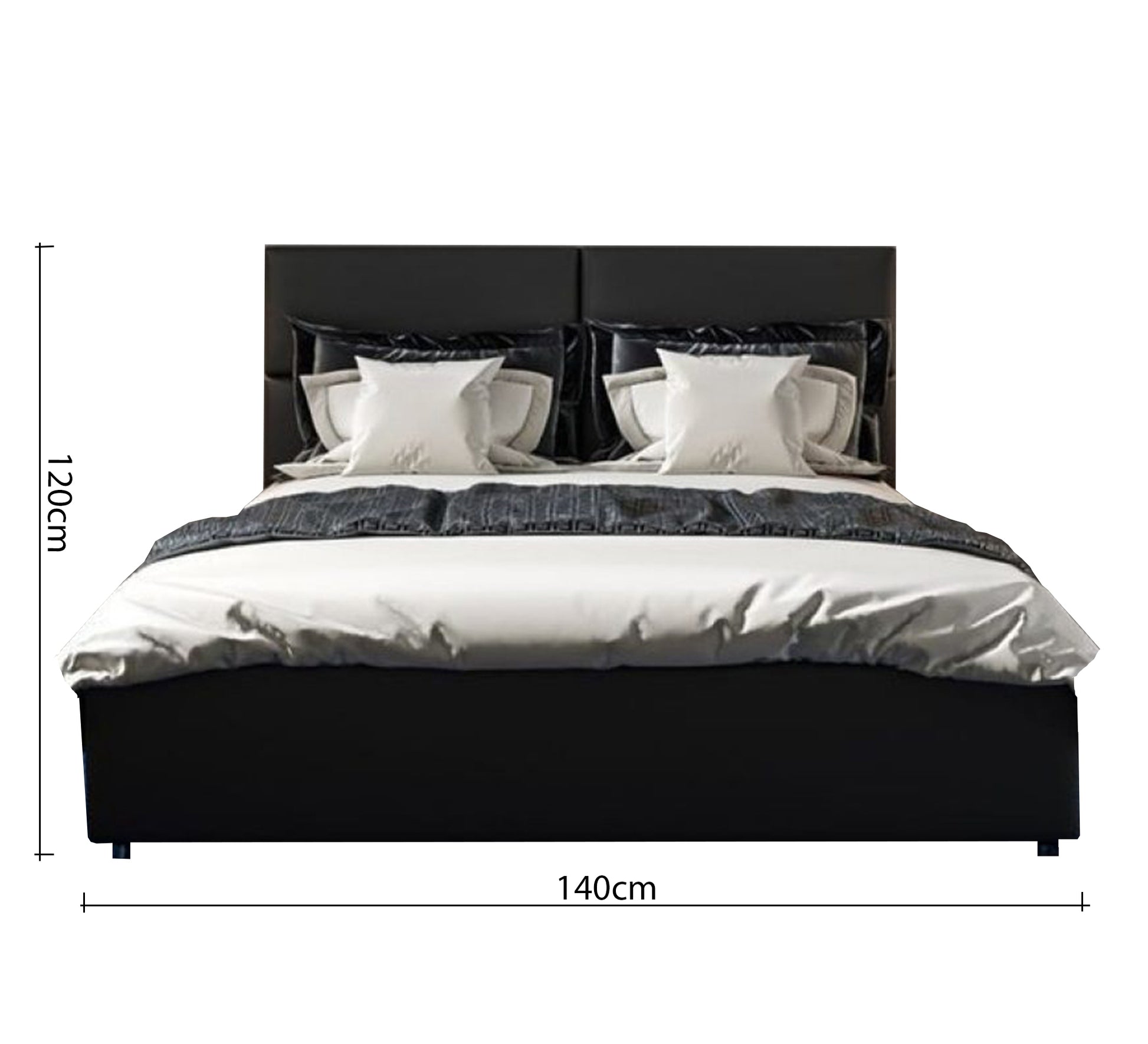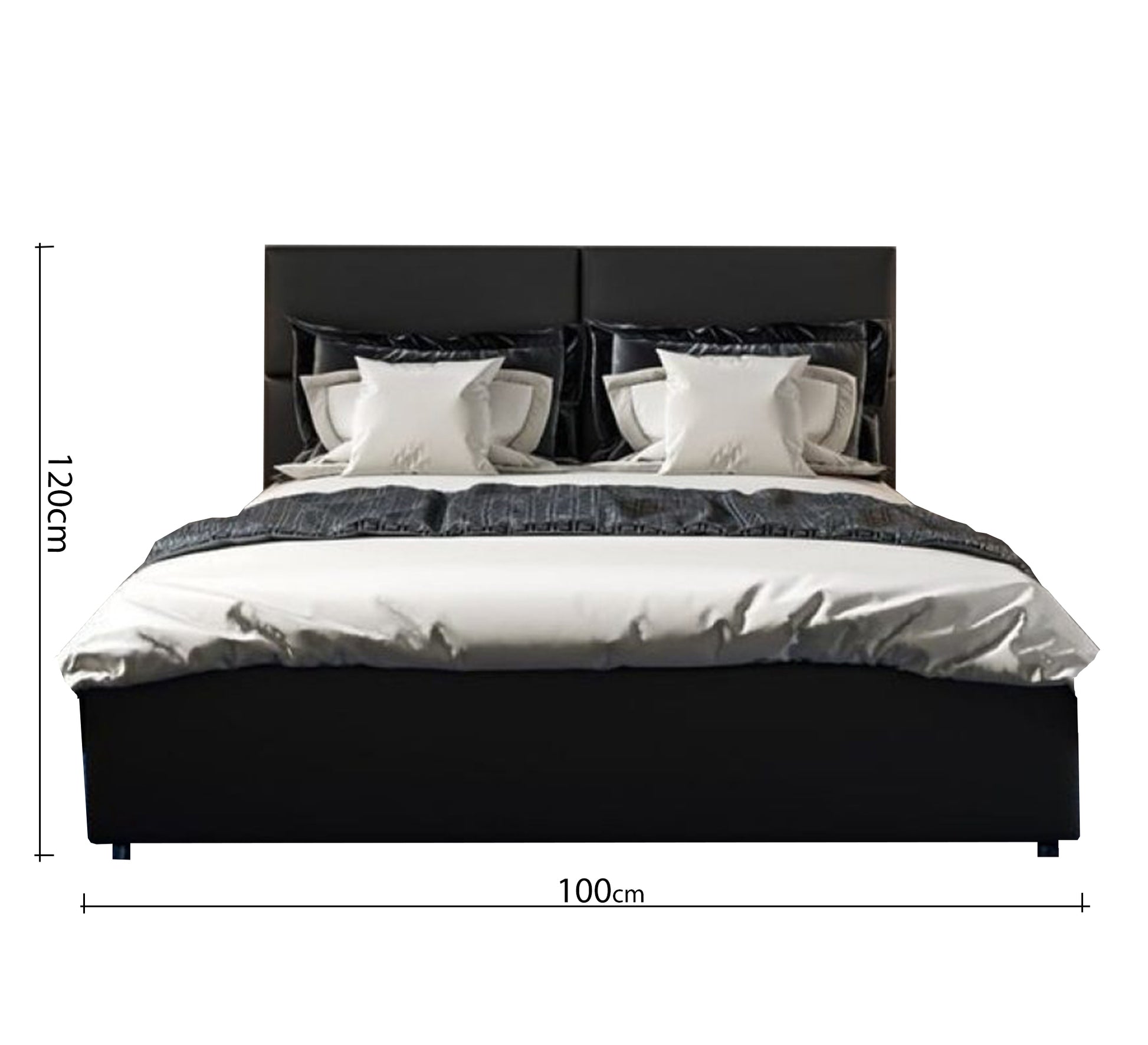 - السرير بطول 195 سم وارتفاع مسند الظهر 120 سم وبعروض مختلفة 100 و120 و140 و160 و180 سم.