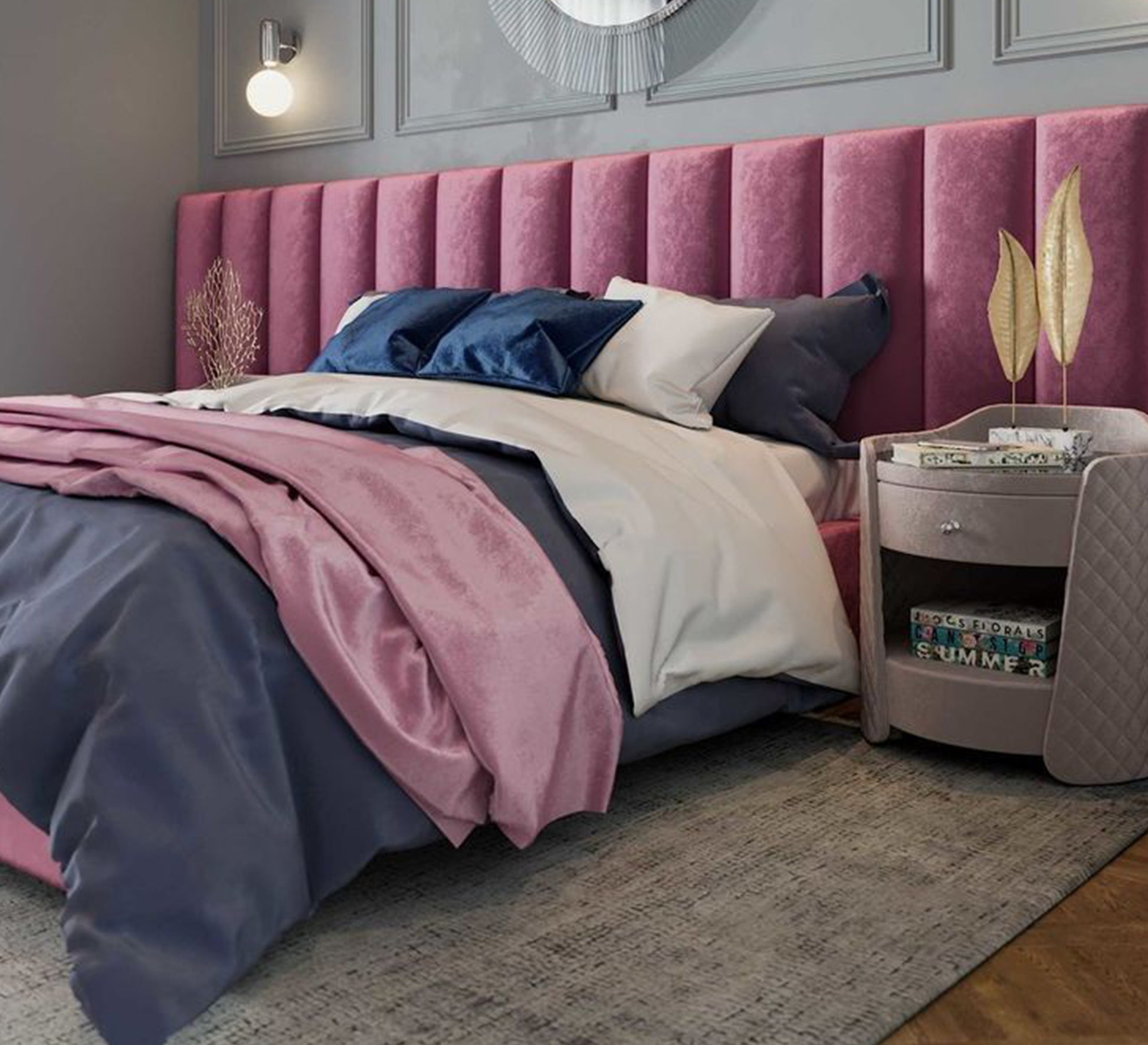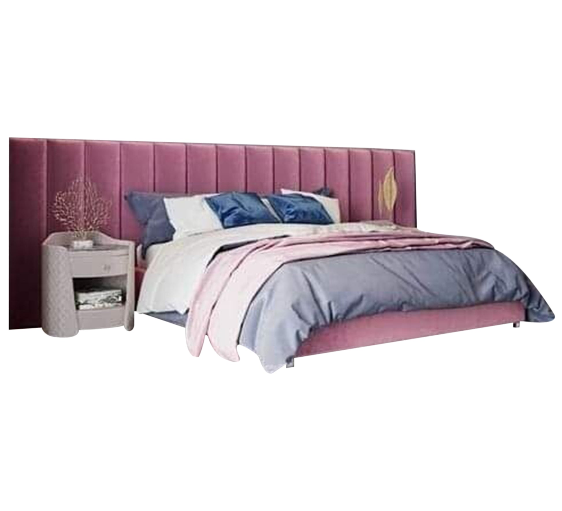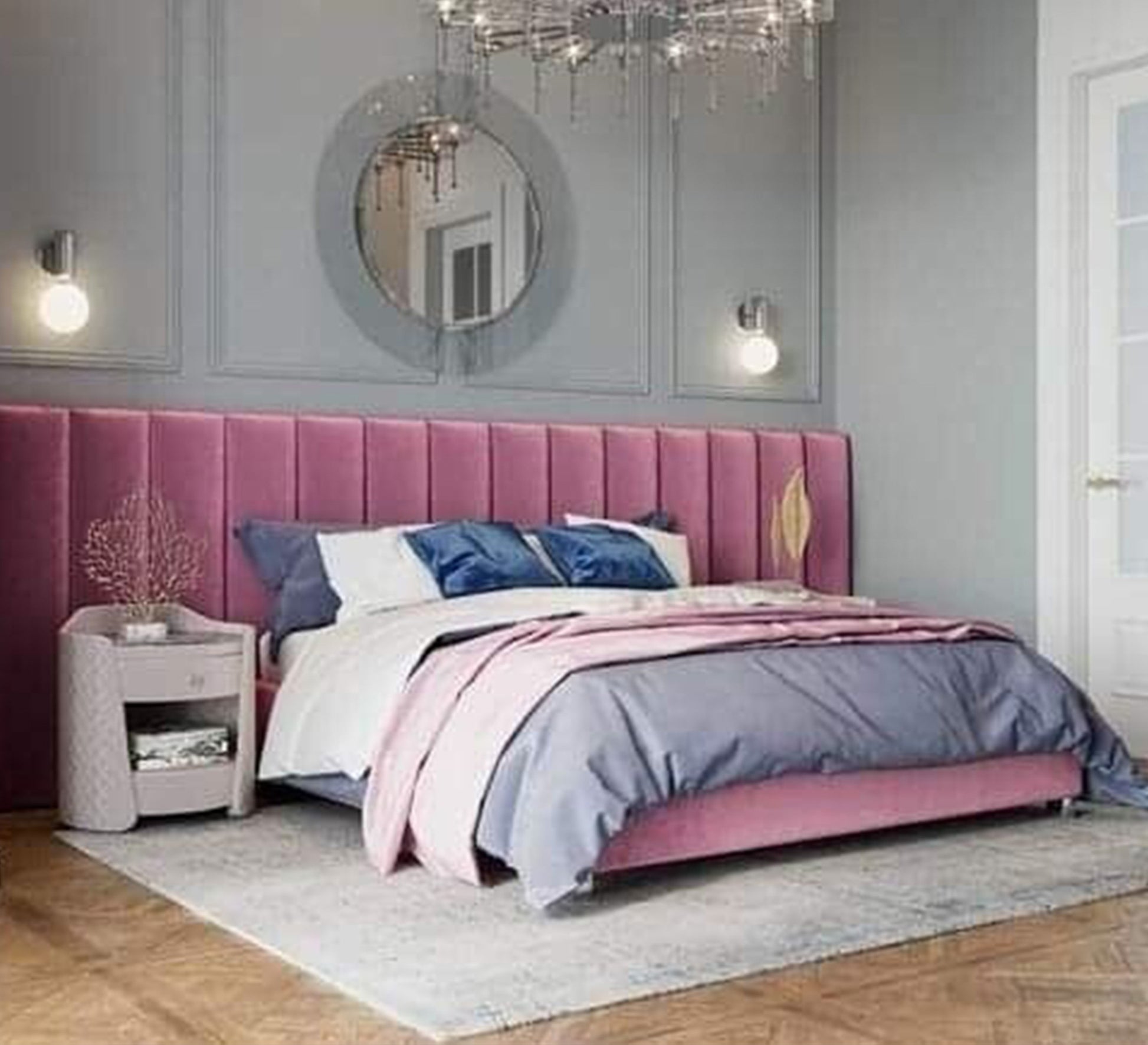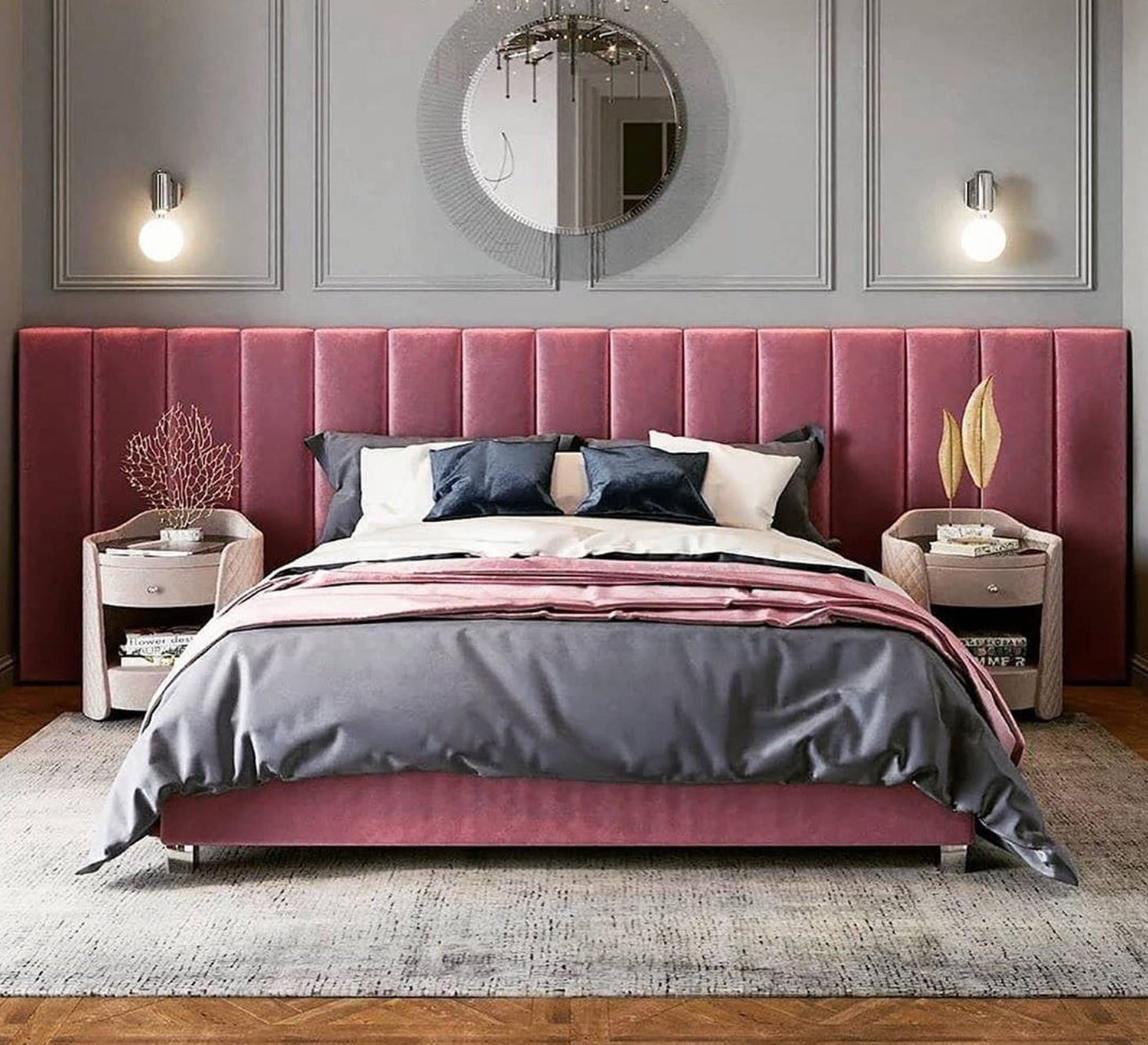 - يتميز هذا السرير بتصميمه الأنيق والعصري الذي يبرزه دمج الألوان الجريئة، حيث يضفي اللون الوردي الداكن للسرير والخلفية لمسة فريدة ومميزة على المساحة.