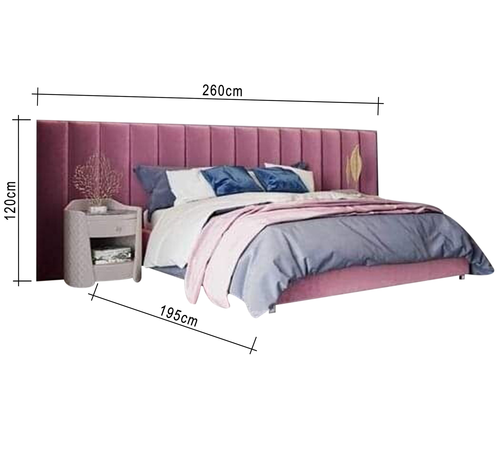 - السرير بطول 195 سم وارتفاع مسند الظهر 120 سم وبعروض مختلفة 240 و260 سم.