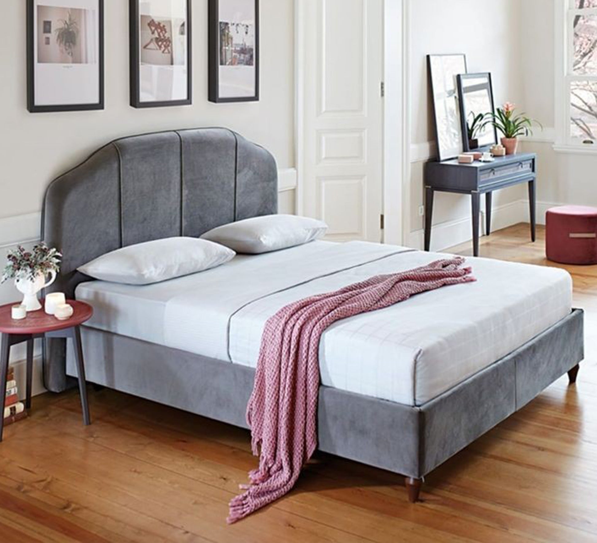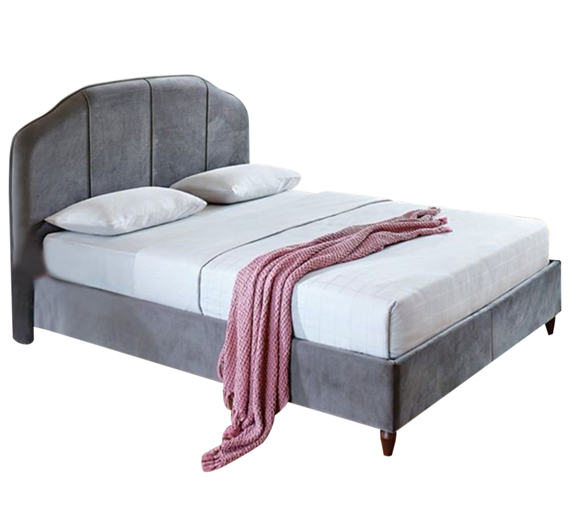 سرير رمادي بتصميم منحني مبطن أنيق