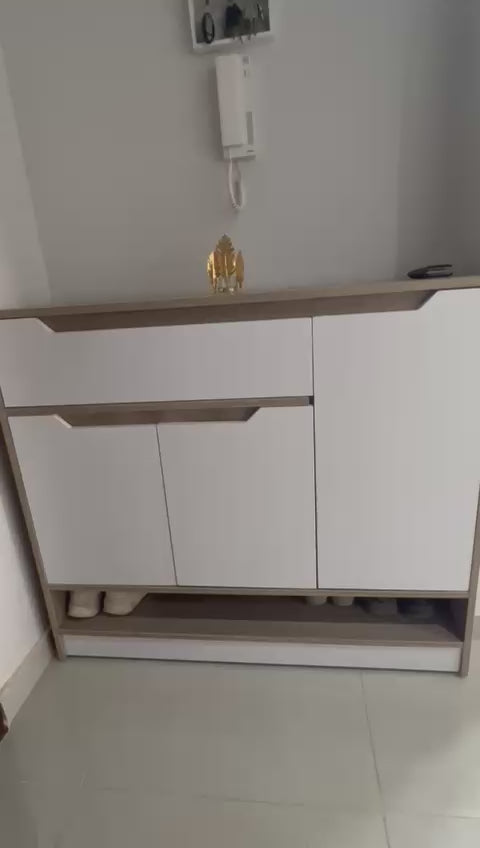 تصميم واسع: تحتوي الخزانة على أبواب مفصلية بمقابض طولية مخططة وتوفر مساحة تخزين كبيرة، بما في ذلك عدة رفوف وأدراج لتنظيم الأغراض بسهولة.