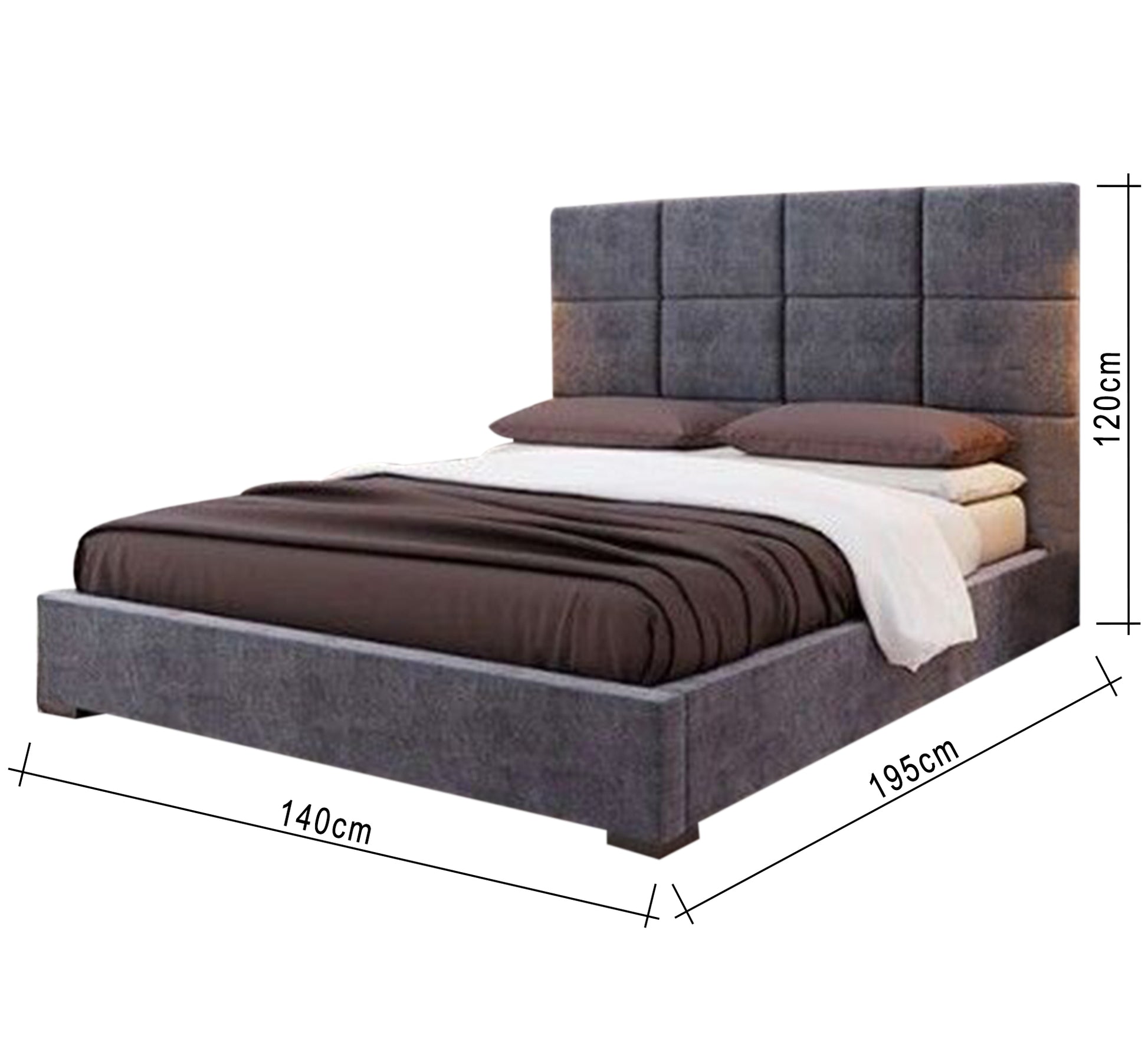- السرير بطول 195 سم وارتفاع مسند الظهر 120 سم وبعروض مختلفة 100 و120 و140 و160 و180 سم.