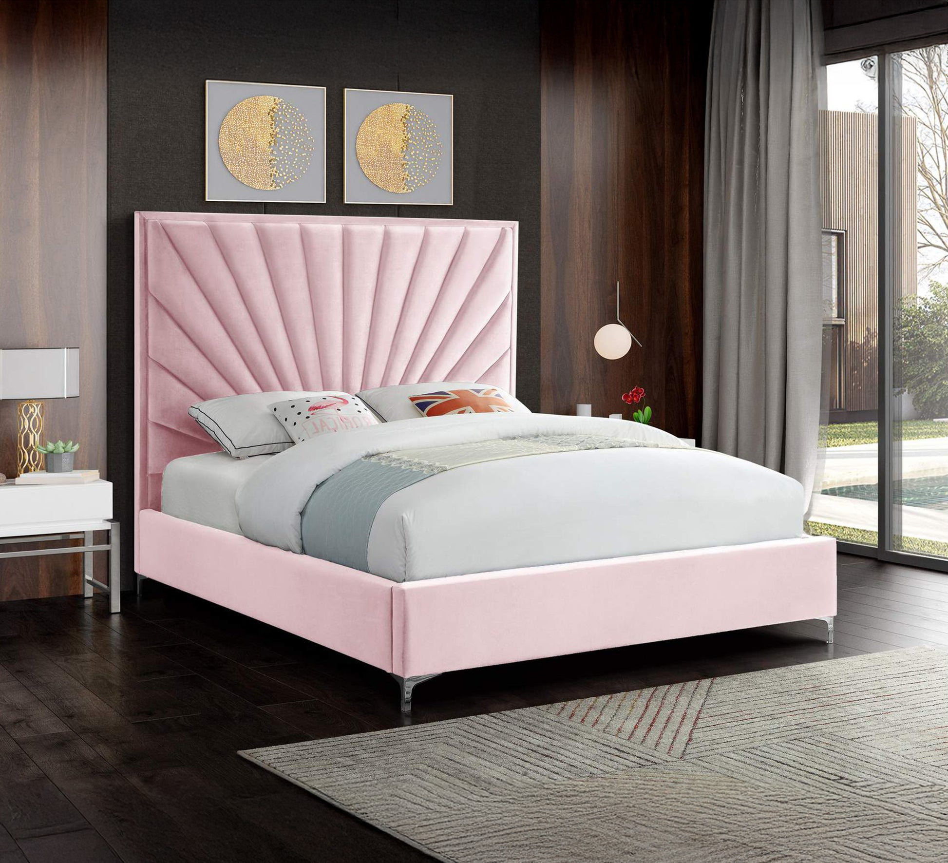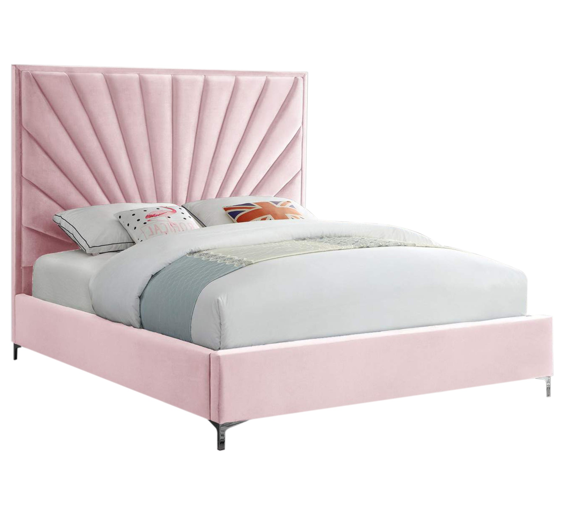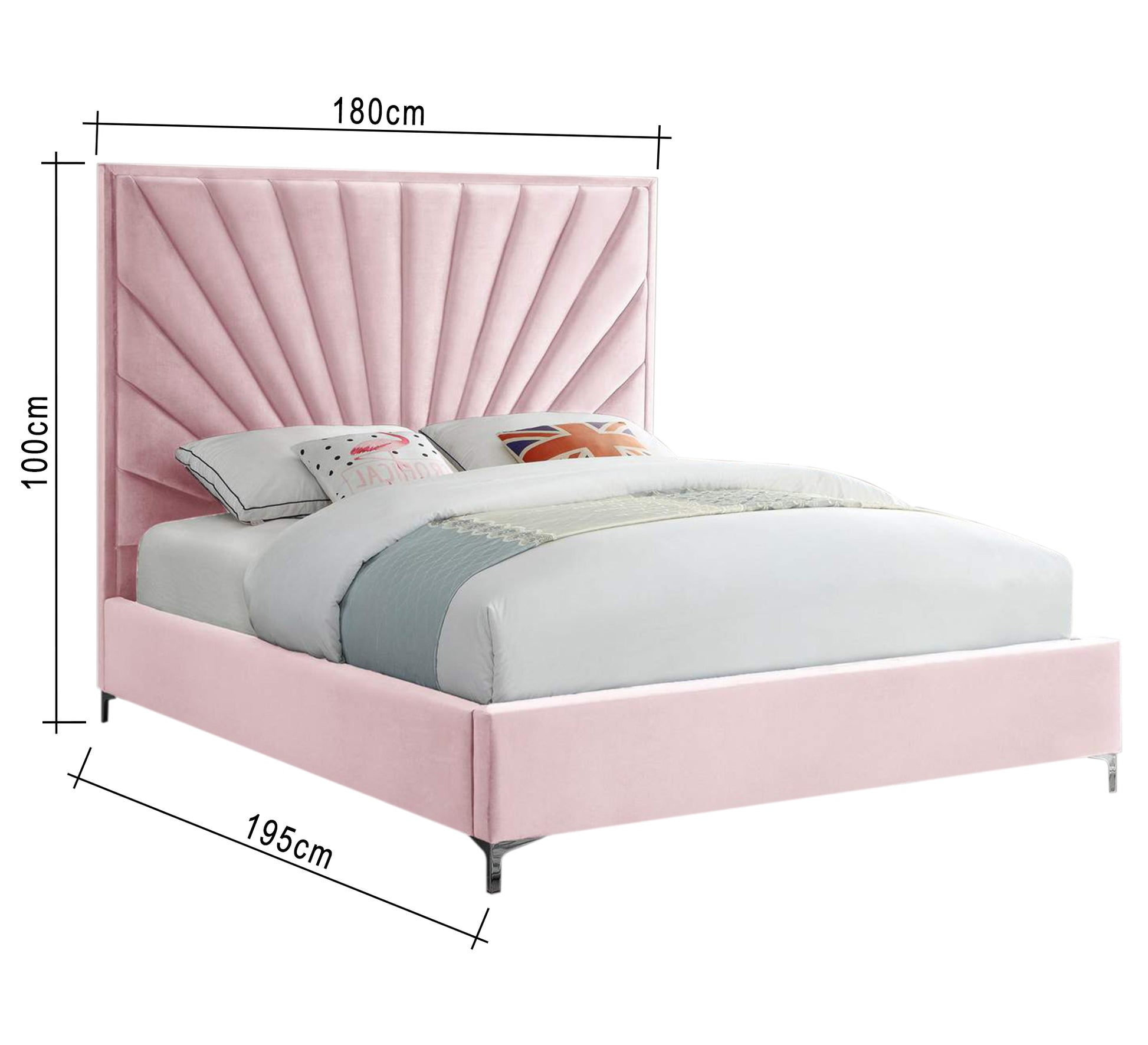 - يرتكز السرير على أرجل فضية لامعة، مما يضيف لمسة عصرية وأنيقة تناسب غرف النوم ذات الطابع الأنثوي أو الجريء.