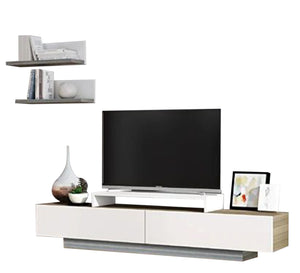 - احصل على ترابيزه تلفزيون باللون الابيض والبيج الخشبى مكون من 2 ضلفه قلاب و2 رف حائطى علوى مع رف شبكي إضافي في منتصف حامل التلفزيون الخاص بك، يمكنك أيضًا تنظيم أقراص DVD أو Xbox أو Playstation أو الكتب أو أجهزة التحكم عن بعد أو مكونات اخرى.