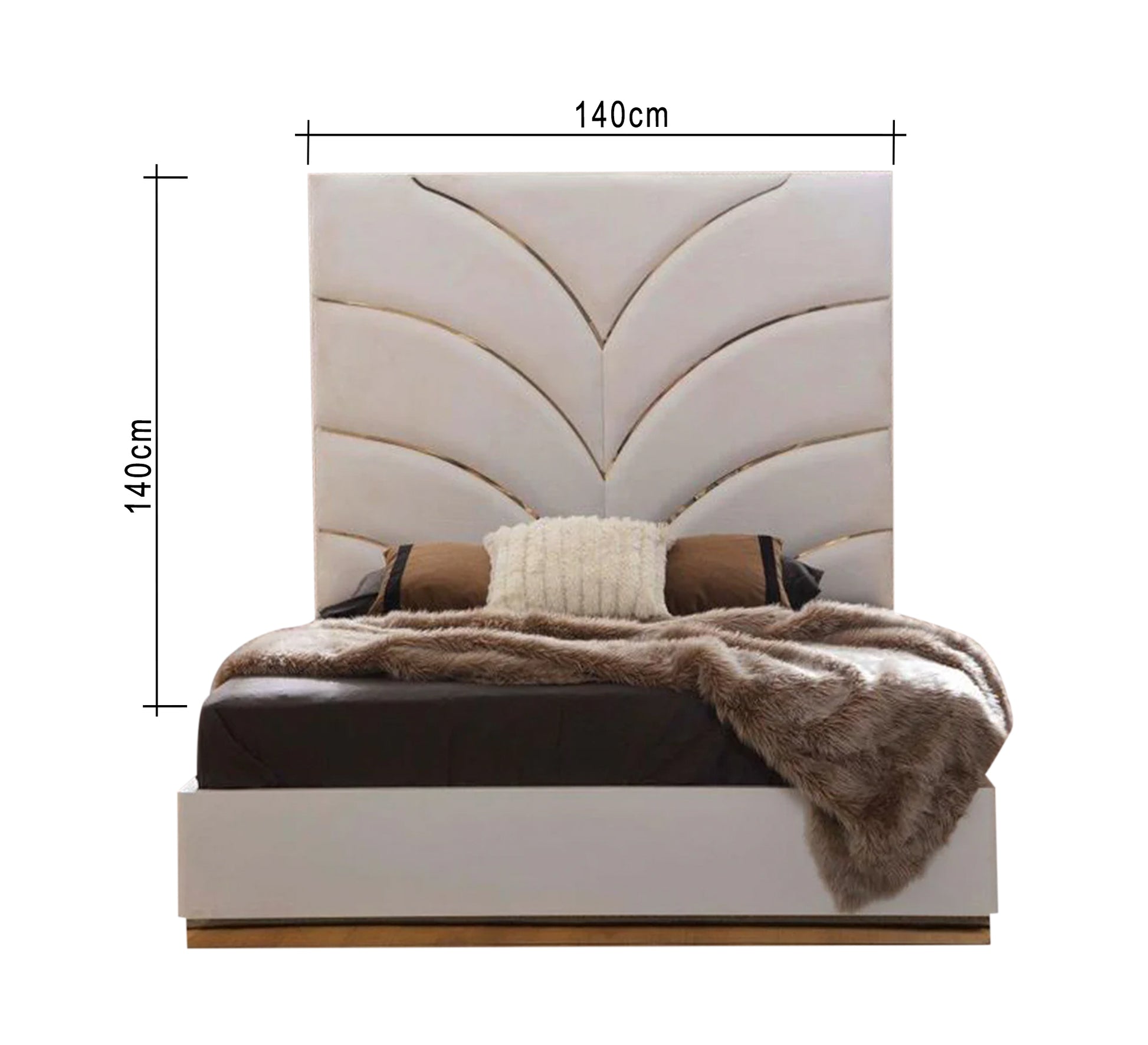 - يرتكز السرير على قاعدة عريضة مع تفاصيل ذهبية عند الأسفل، مما يجعله قطعة مركزية راقية تضفي لمسة من الفخامة على أي غرفة نوم.