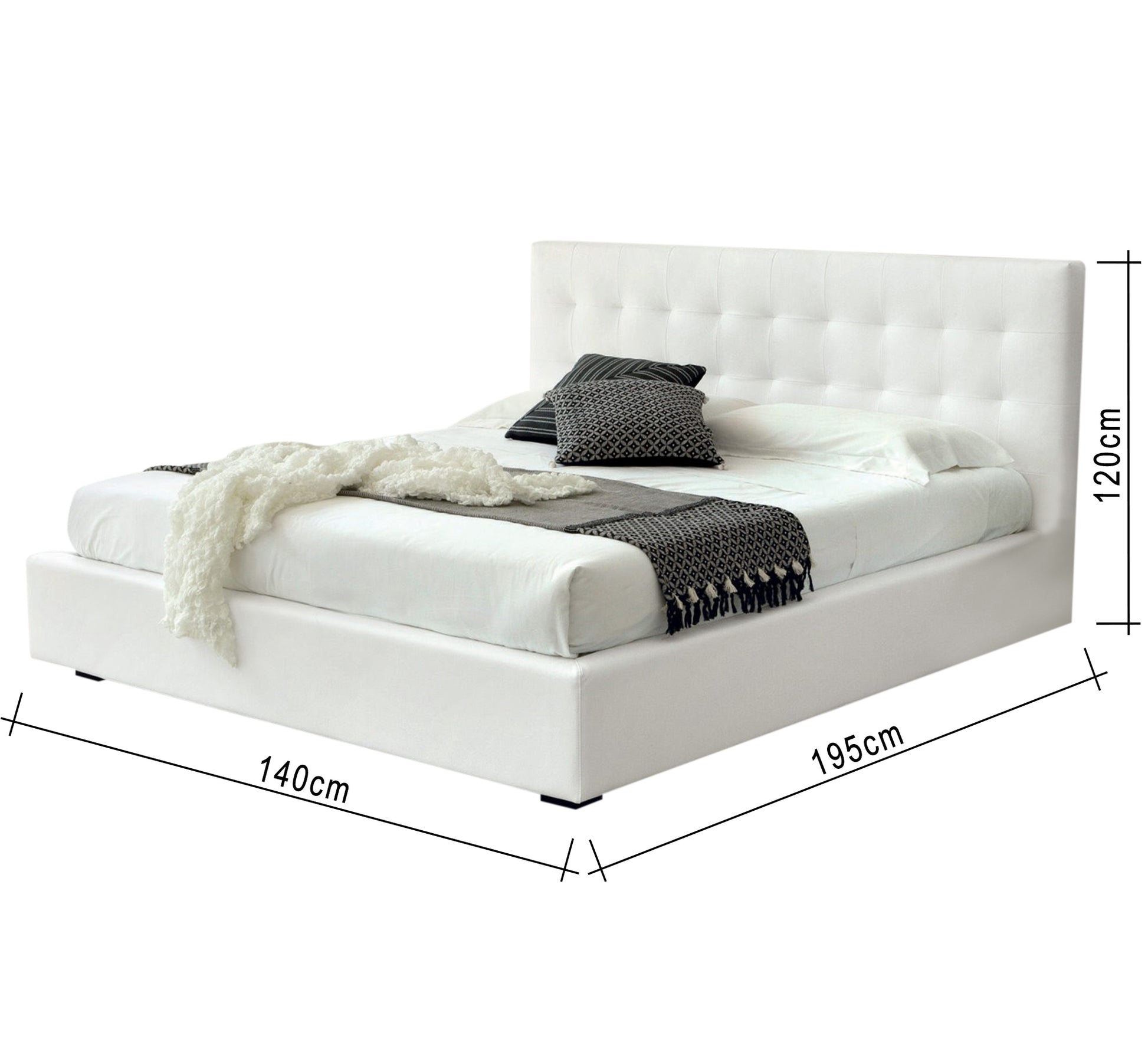 - السرير بطول 195 سم وارتفاع مسند الظهر 120 سم وبعروض مختلفة 100 و120 و140 و160 و180 سم.