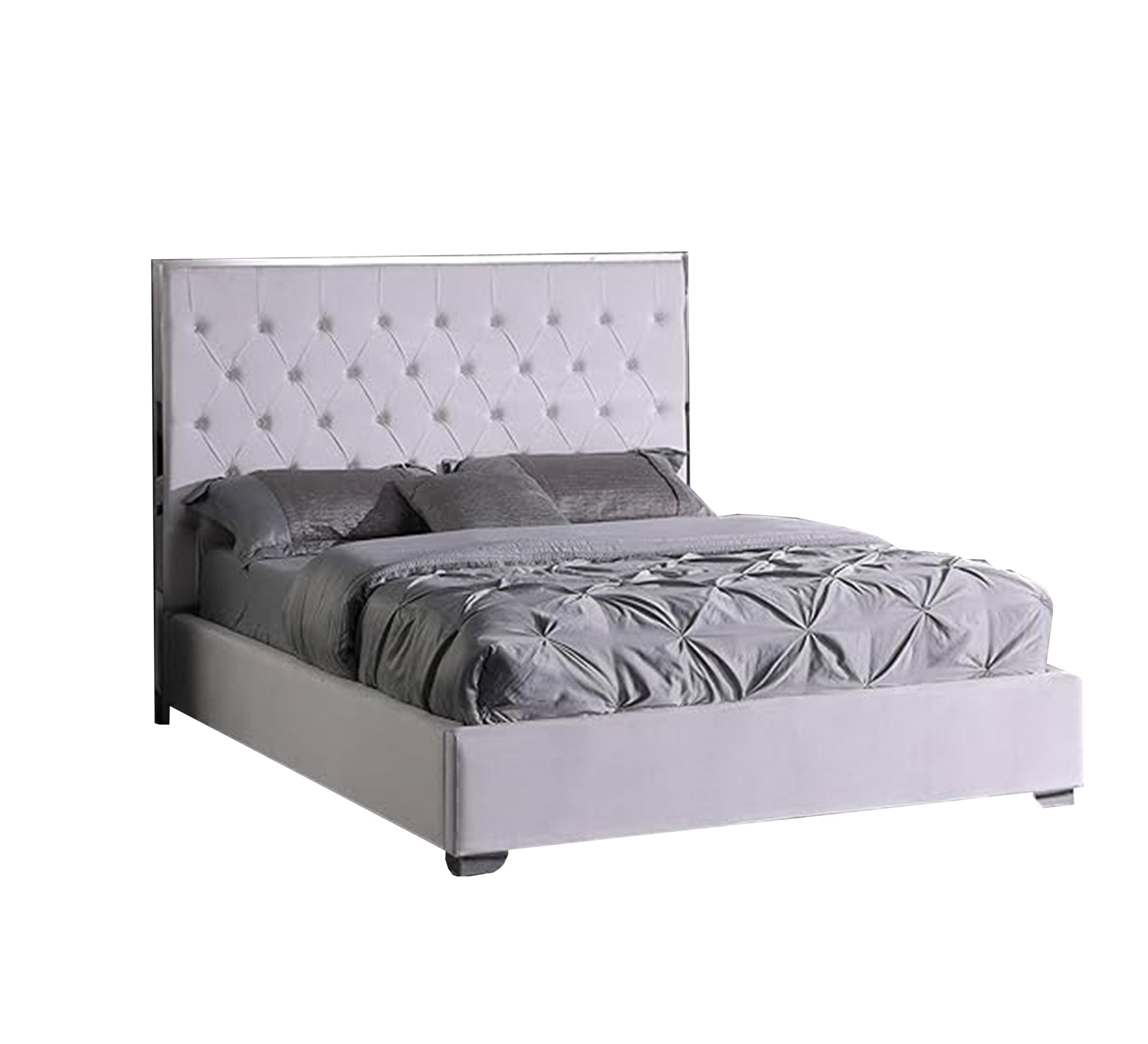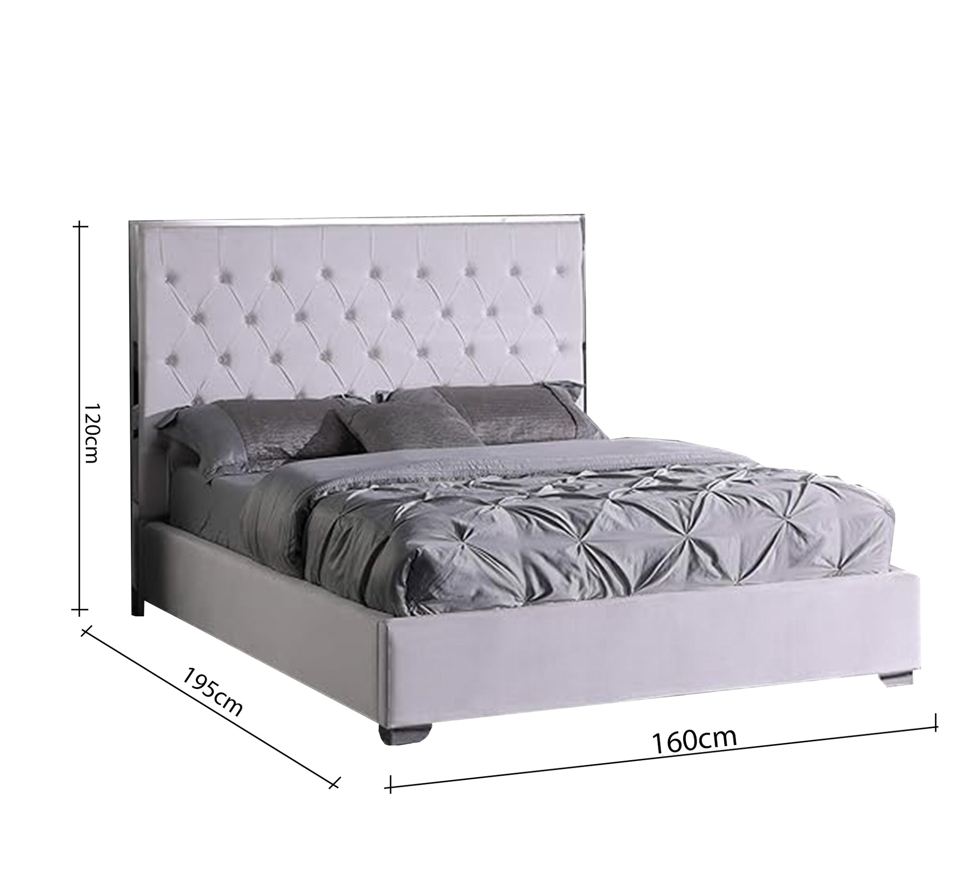 - يحيط برأس السرير إطار معدني لامع يبرز جمال التصميم، ليقدم قطعة أثاث تجمع بين الراحة والجاذبية البصرية في أي غرفة نوم.